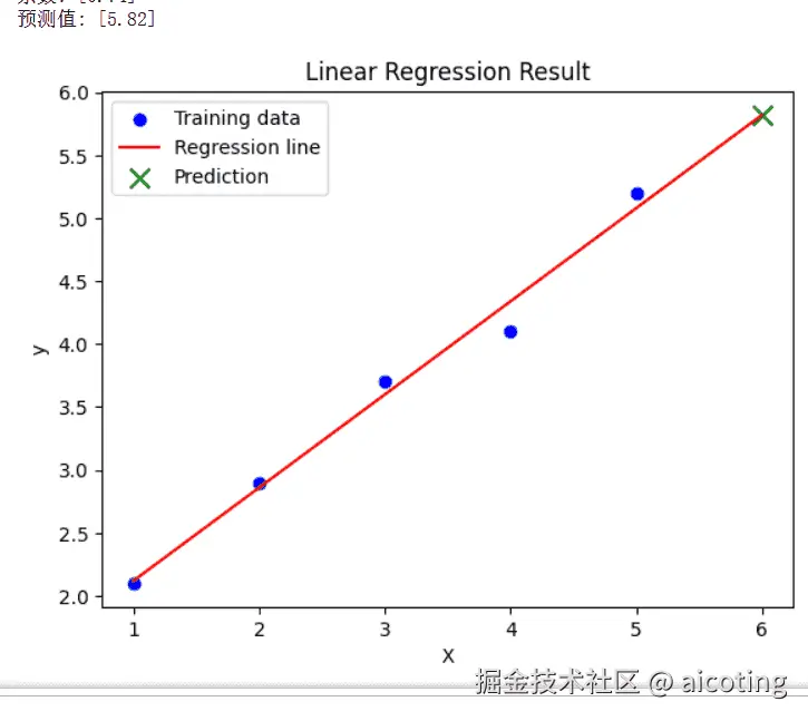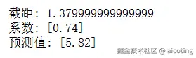 可以看到线性回归得到的方程为y=0.74x+1.379999(好多9),预测出来了当x为6的时候,y的值为5.82。