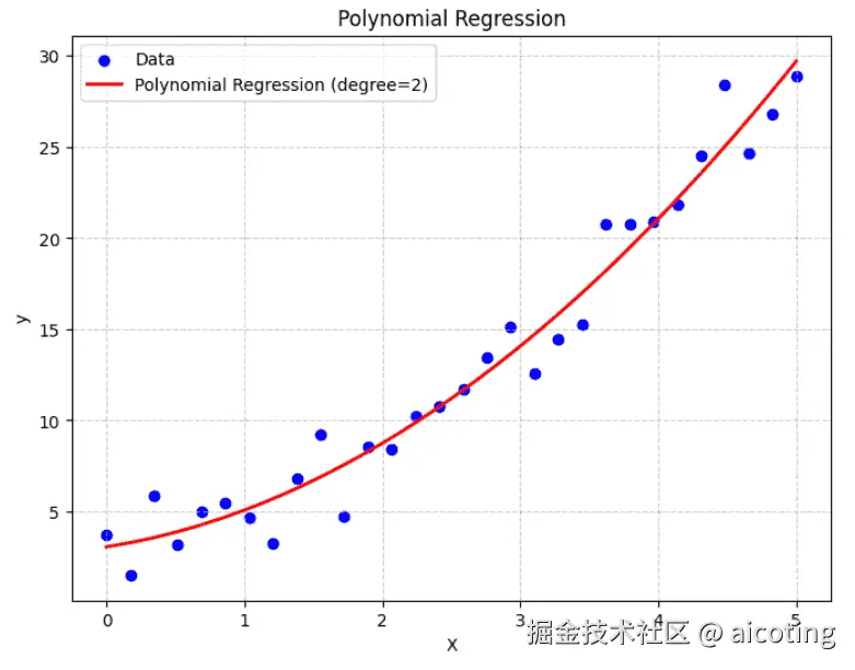 运行结果如下,其中蓝点是真实数据(带噪声的二次曲线),红线是多项式回归的拟合结果,可以很好地捕捉曲线趋势。