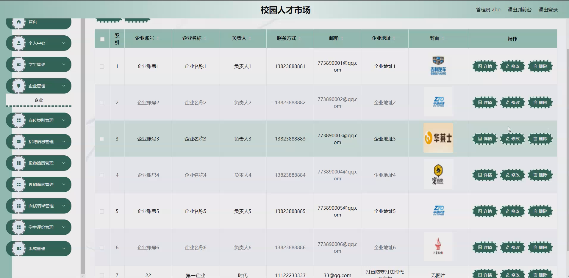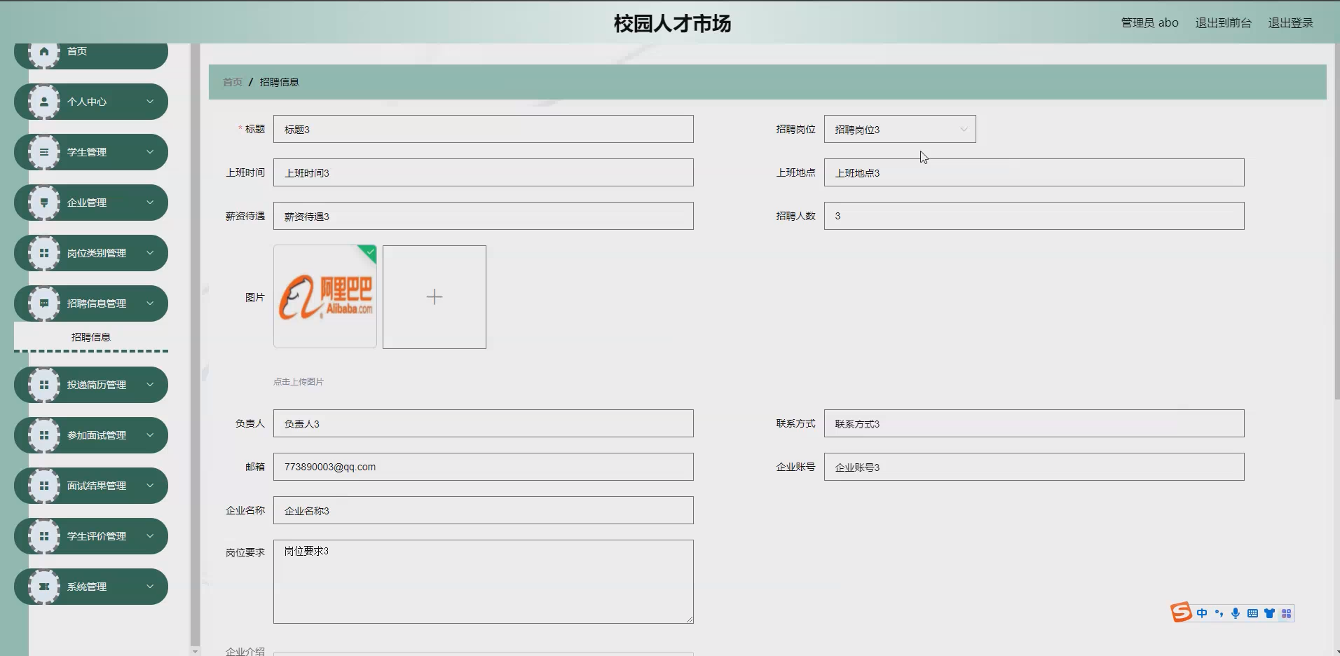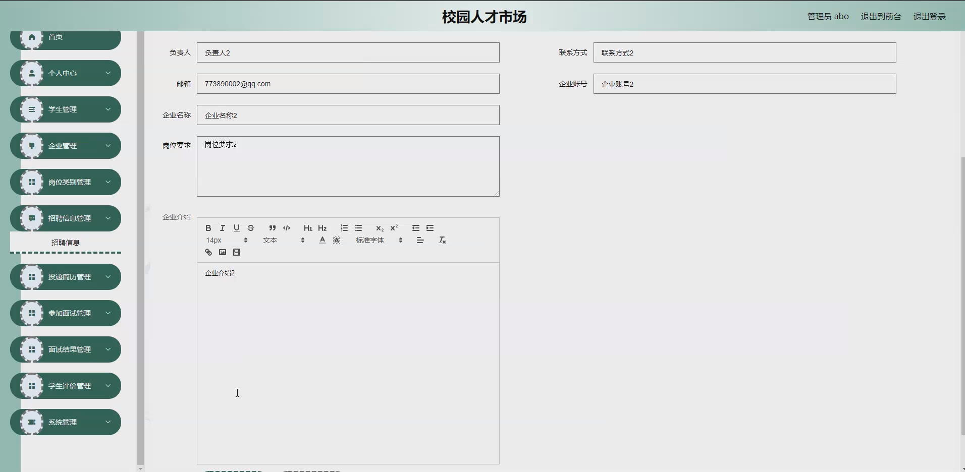 基于SSM框架开发一套功能完善、运行稳定的校园人才市场系统,实现"学生管理、企业管理、招聘信息发布、岗位类别管理、简历投递、面试组织、结果反馈、学生评价"八大核心功能。达成校园招聘流程数字化、供需匹配精准化、服务管理规范化,解决传统校园招聘的效率低、信息不对称等问题,为学生、企业及管理方提供高效便捷的服务支撑。