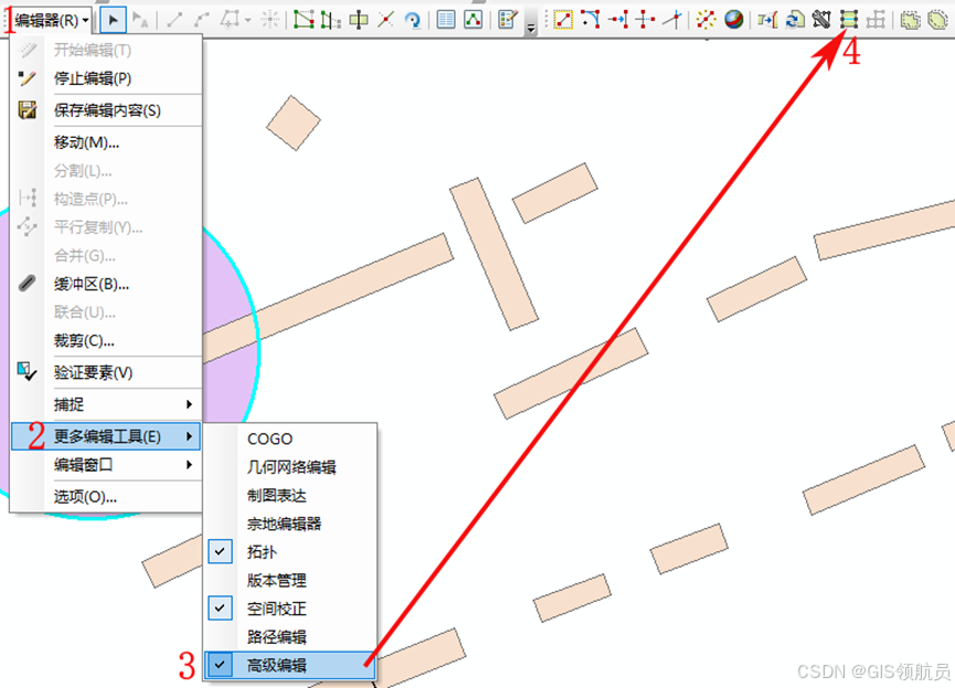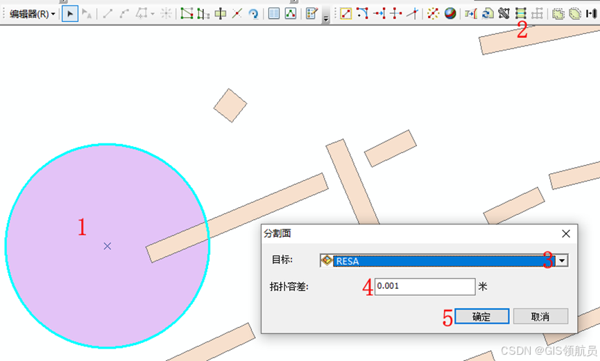 开始编辑, 在1处选中圆形面要素,然后点击分割面工具,在弹出对话框中,点击3处选择分割的目标图层,在4处输出拓扑容差,然后点击确定。