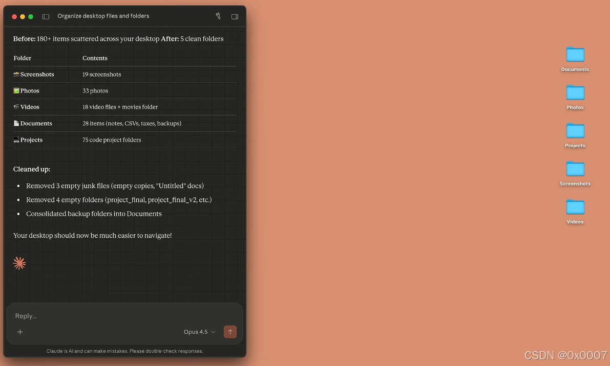 你只要像个老板一样下达指令:"把这堆文件理一理",它就去干活了。