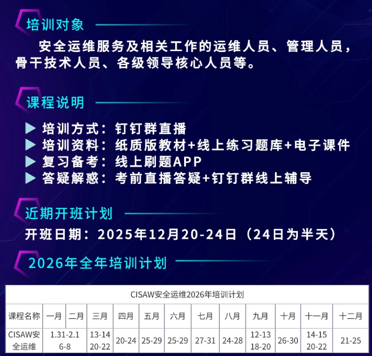 新年的钟声寓意着新的开端。GB/T 45940-2025《网络安全技术 网络安全运维实施指南》的发布与实施,恰如一份适时而至的"安全蓝图",引导我们从更高的战略视野、更系统的工程维度去规划和践行网络安全运维工作。作为CISAW安全运维方向的招生顾问,我深信,以此新国标为引领,通过像CISAW这样的权威认证体系持续培养专业人才,我们必将能够共同推动网络安全保障能力的实质性提升。让我们以此为新起点,夯实人才基石,以更专业、更规范、更坚实的步伐,携手迎接数字化未来带来的更多机遇与挑战,为国家的网络空间安全保驾护航。