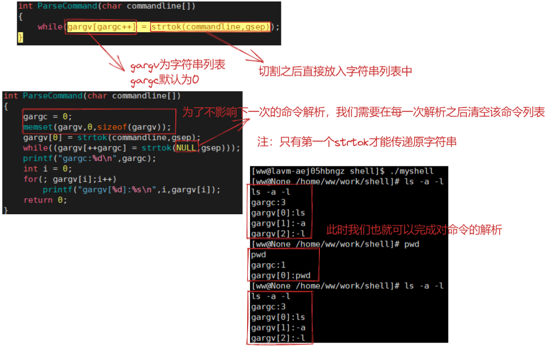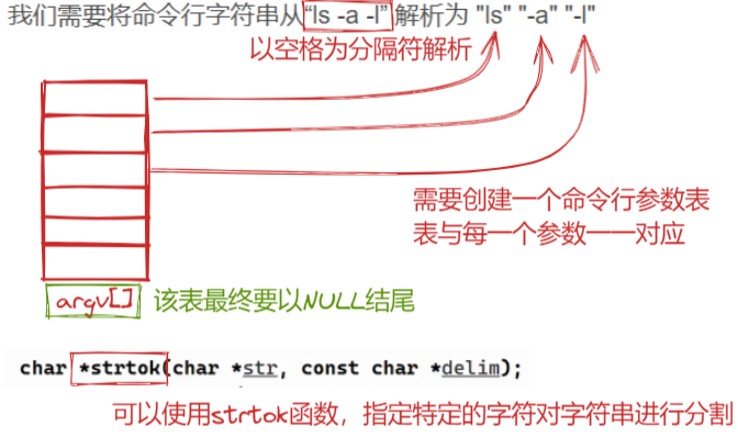 命令行解析命令:bash来解析命令行,其实和我们手搓的解析类似,都需要将一个字符串分割成一个一个小的命令,制成一个命令行参数表