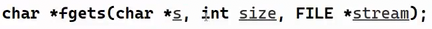 fgets()可以从指定的文件(stream)中,获取到字符串s,该字符串的长度为参数size