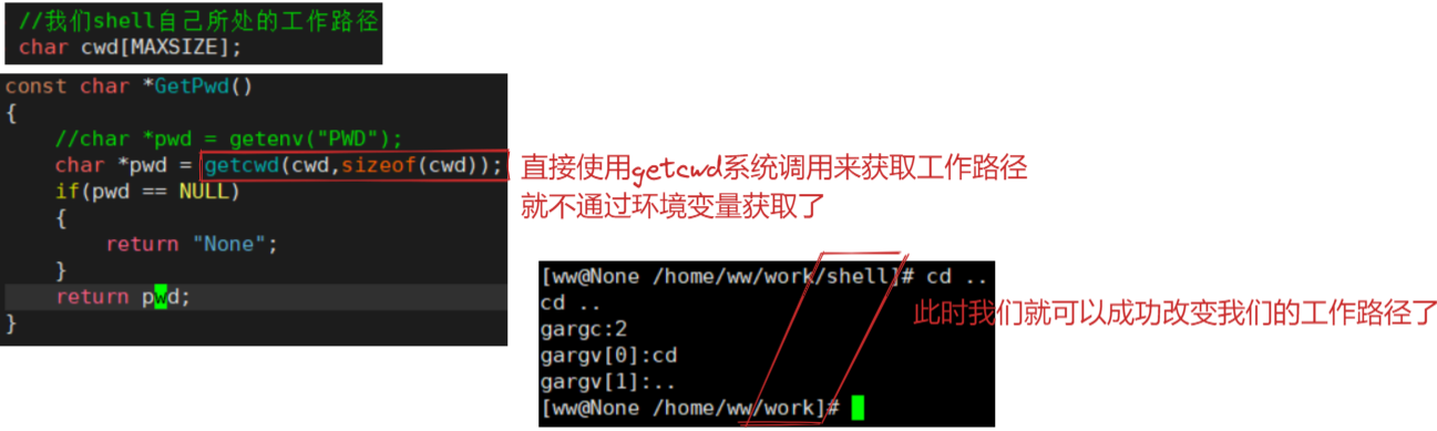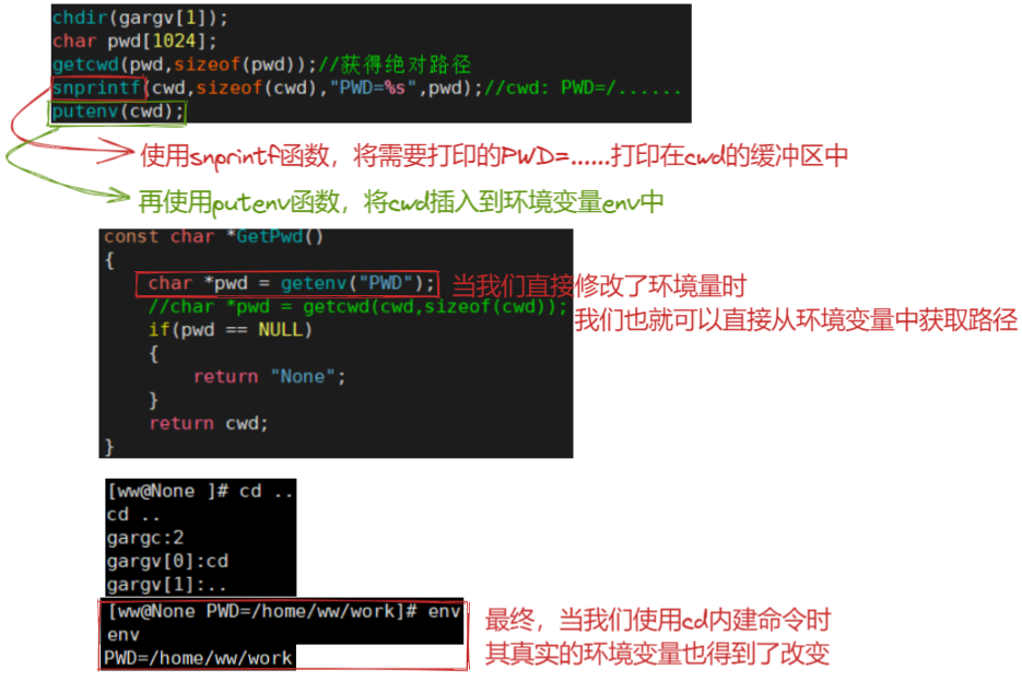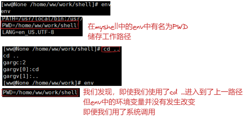 我们使用chdir是用户层面的数据进行更改,并不是操作系统的数据进行了更改,所以,我们需要让bash自己更改环境变量!