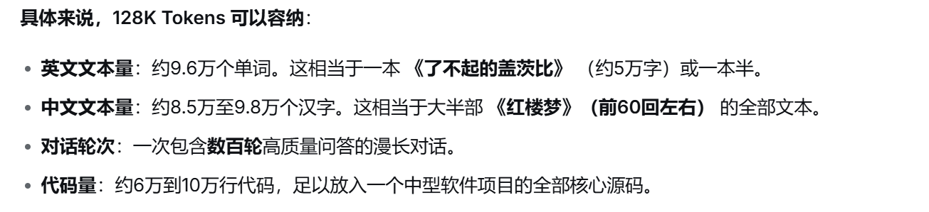 128K Tokens不是内容在硬盘上的"大小"(那叫文件体积,单位是MB/GB),而是模型在处理时,能同时"照亮"和"考虑"的Token的"最大数量"。