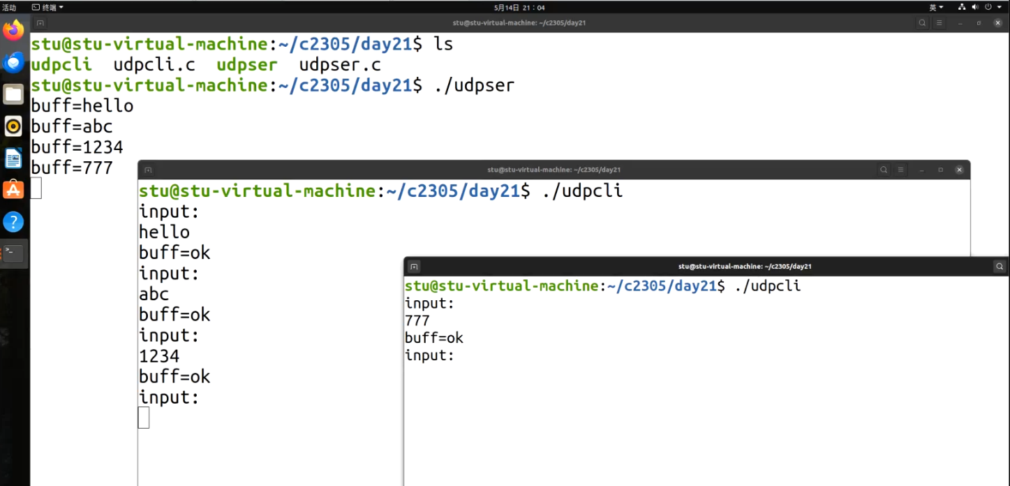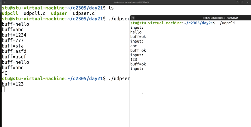 ./udpser后,依次接收到客户端发送的hello、abc、1234、777,并打印这些消息; - 客户端(右侧两个终端) :启动