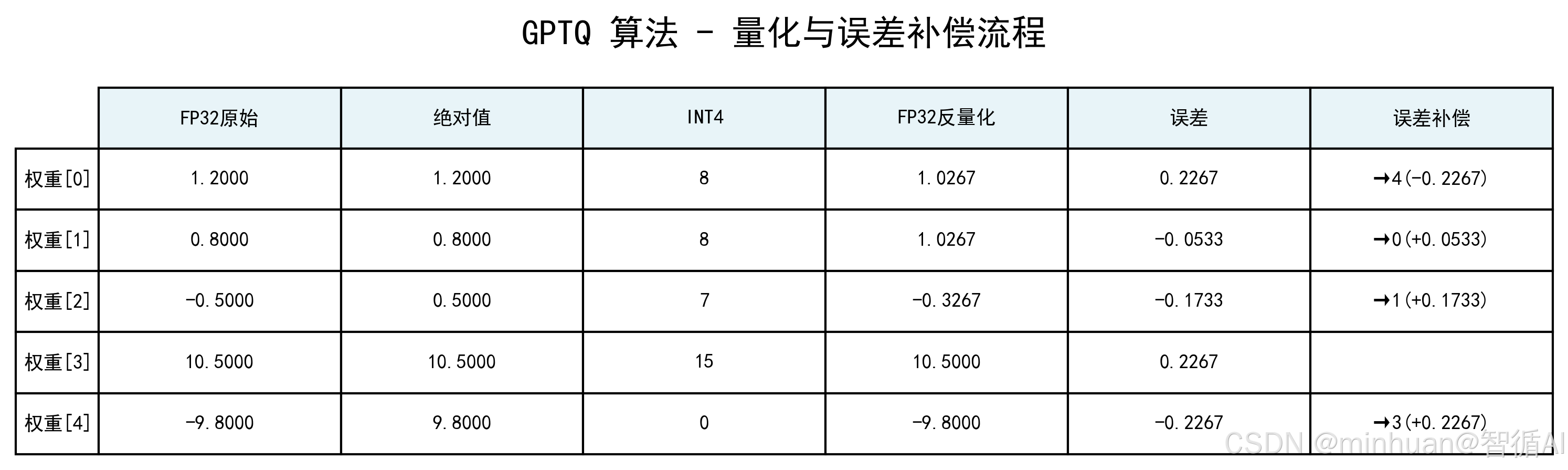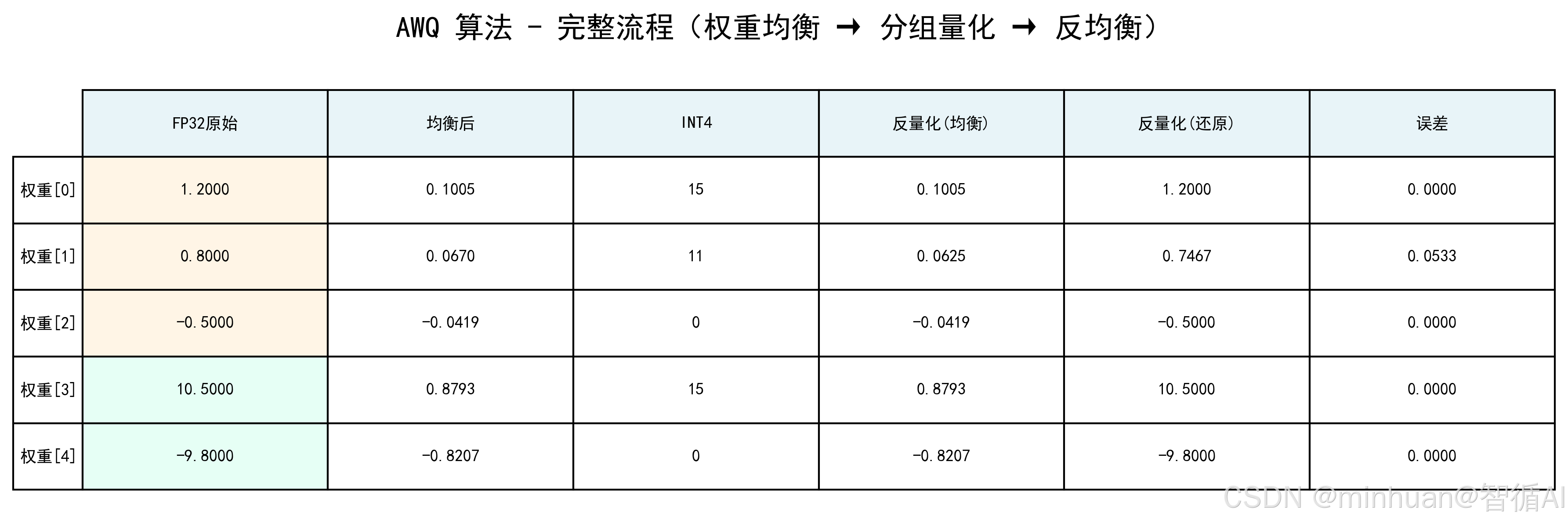 colLabels=['FP32原始', '均衡后', 'INT4', '反量化(均衡)', '反量化(还原)', '误差'],