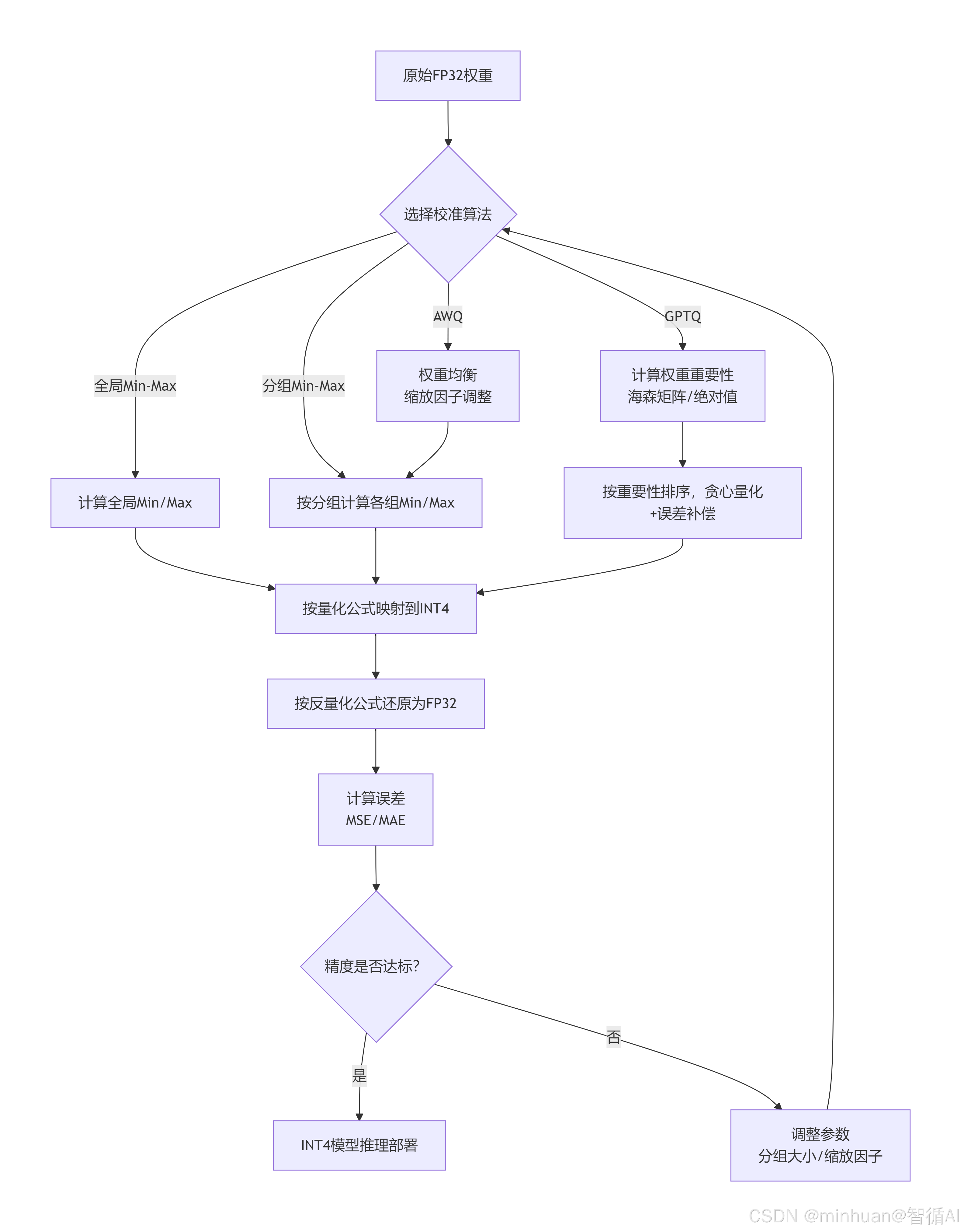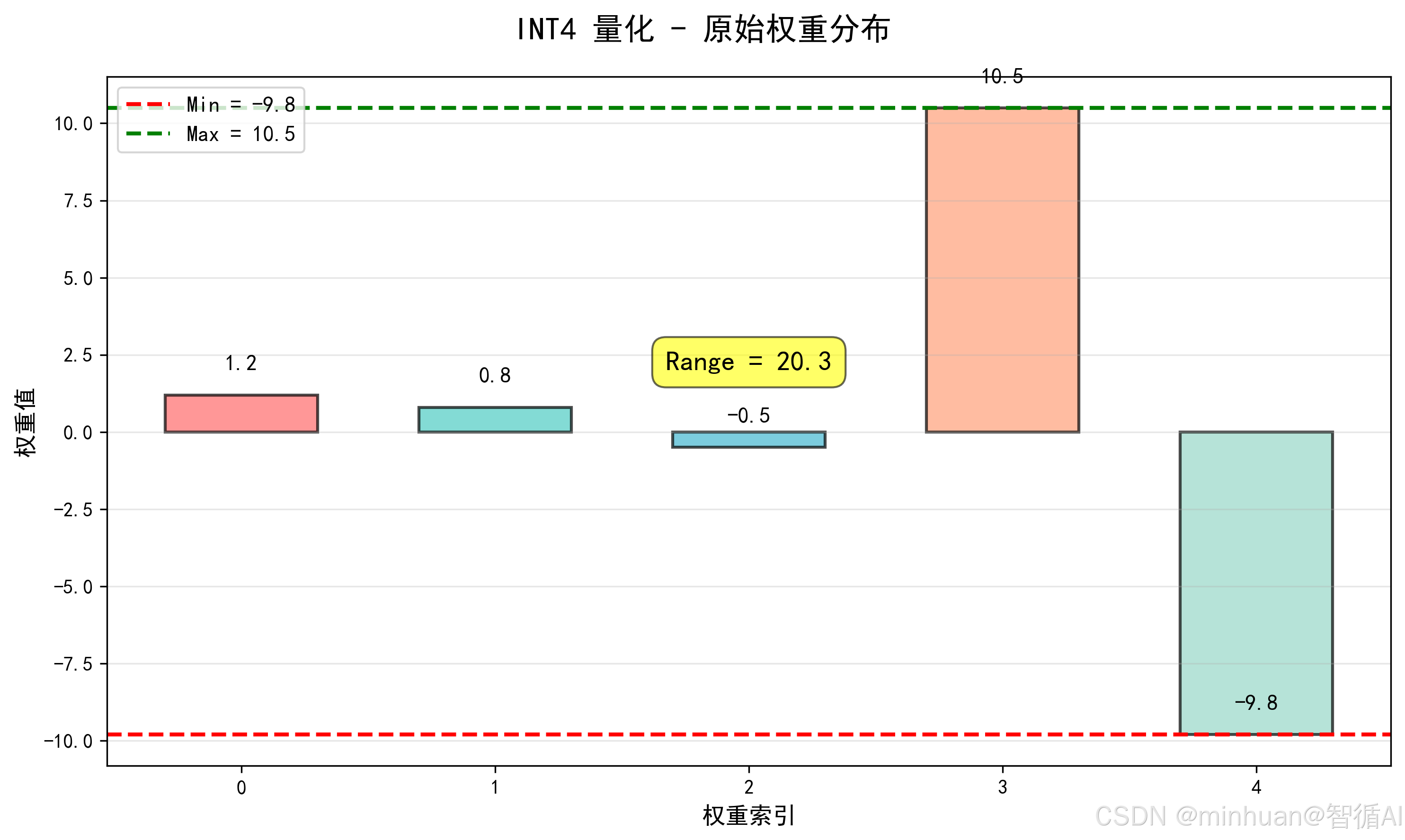 - 步骤 1:遍历模型所有 FP32 权重,找到最大值(Max)和最小值(Min);