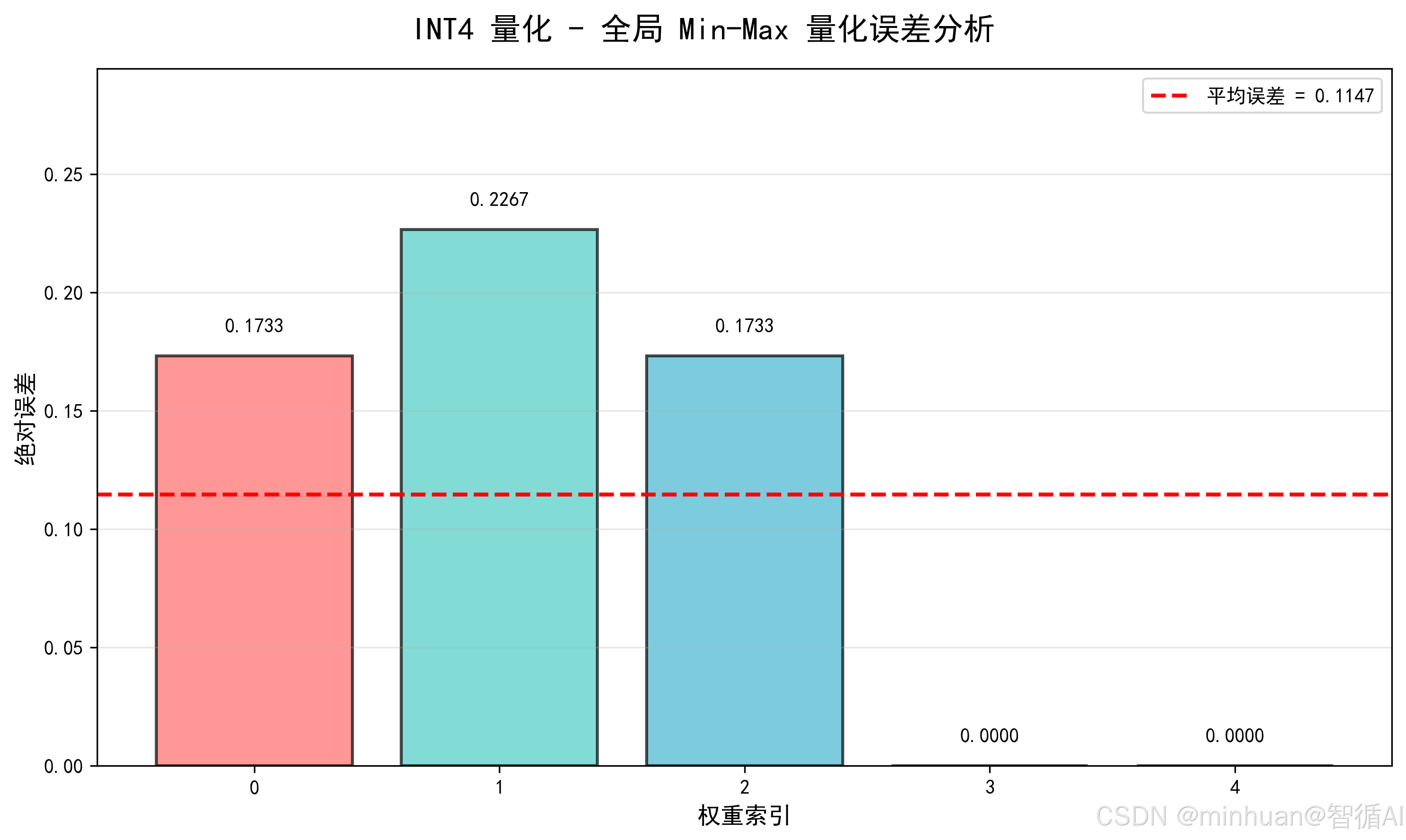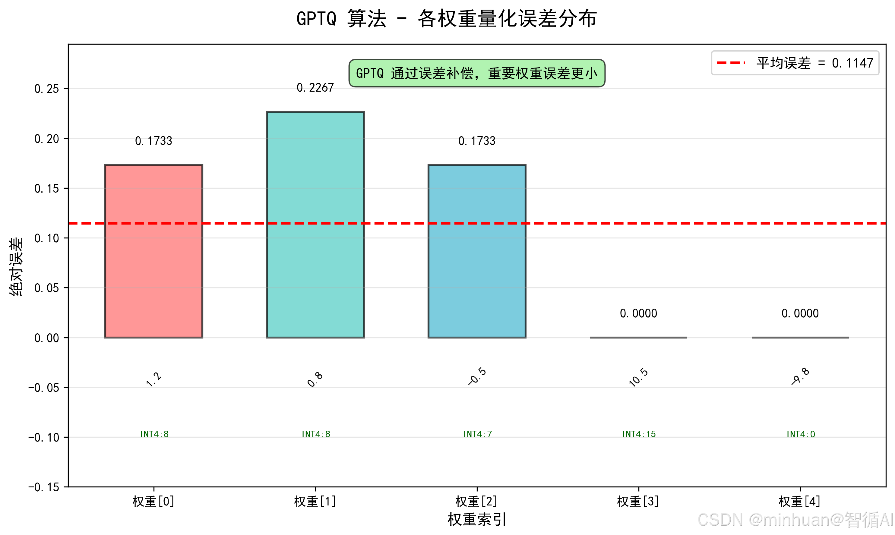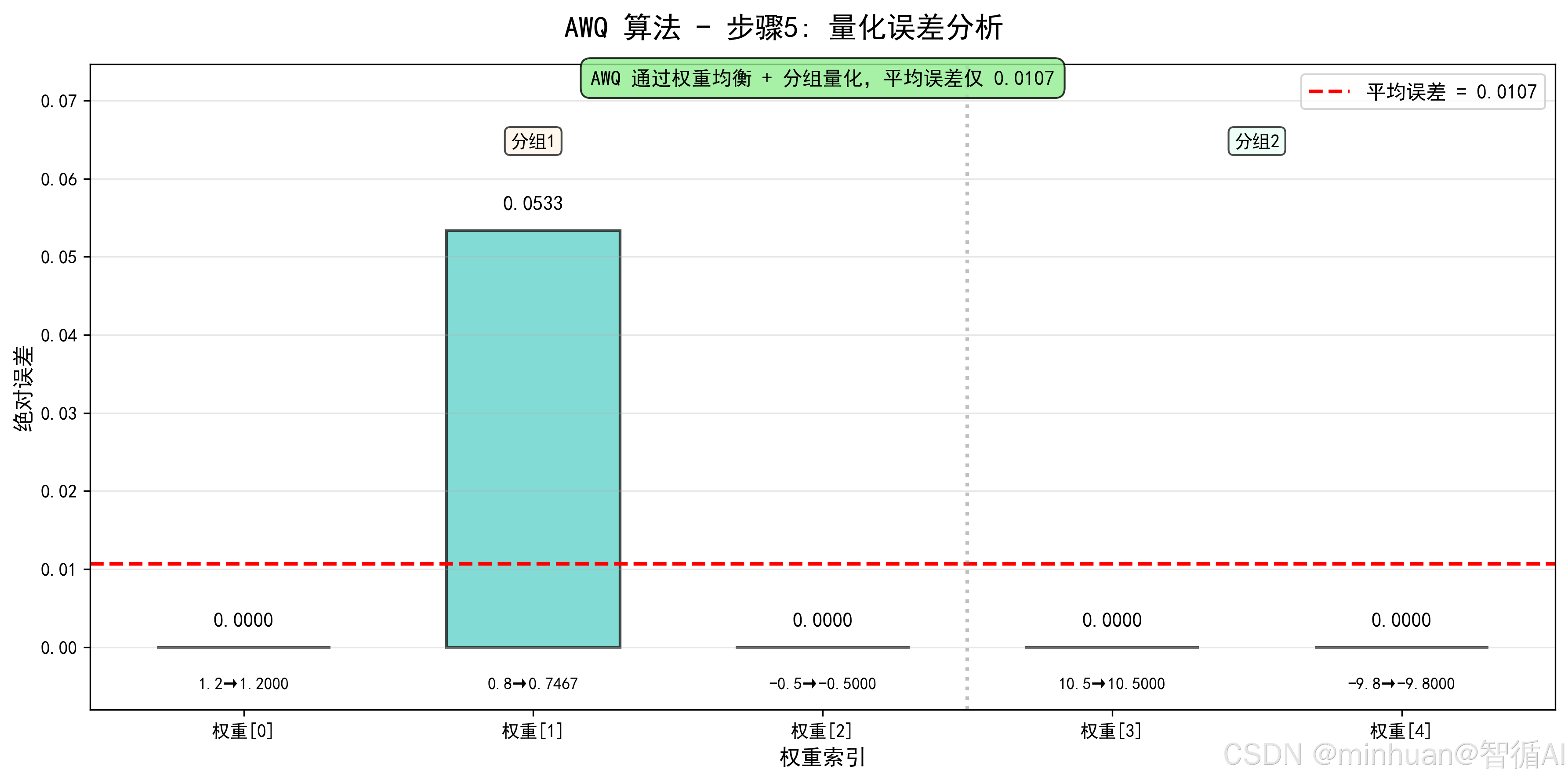 f'AWQ 通过权重均衡 + 分组量化,平均误差仅 {mean_error:.4f}',