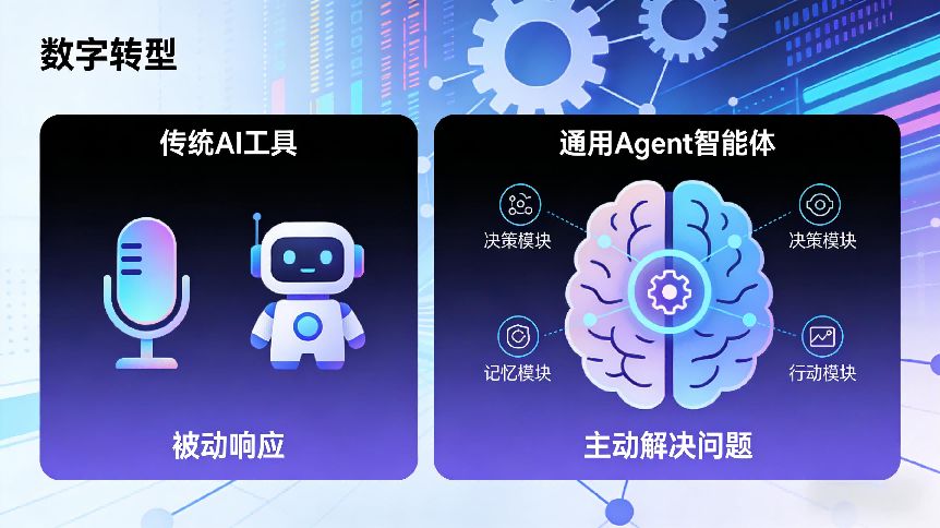 传统AI工具,比如早期的语音助手、问答机器人,更像是"被动响应的工具"------只能在用户给出明确指令后完成预设动作,比如"设置提醒""查询天气"。而通用Agent智能体则是"主动解决问题的数字实体",当你给出"帮我完成季度工作总结"这样的模糊需求时,它会自主拆解为"收集季度工作数据、梳理核心成果、提炼问题不足、规划改进方向、生成规范文档"等多个子任务,还会主动调用表格工具、文档编辑器、数据统计软件等完成全流程闭环。