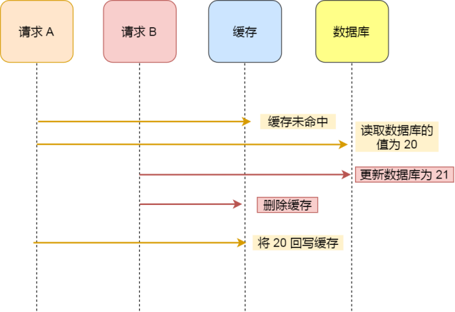 先读取cache发现为空,然后去db写入,随后一个写入请求写入db并删除cache,然后写操作再去cache写入。