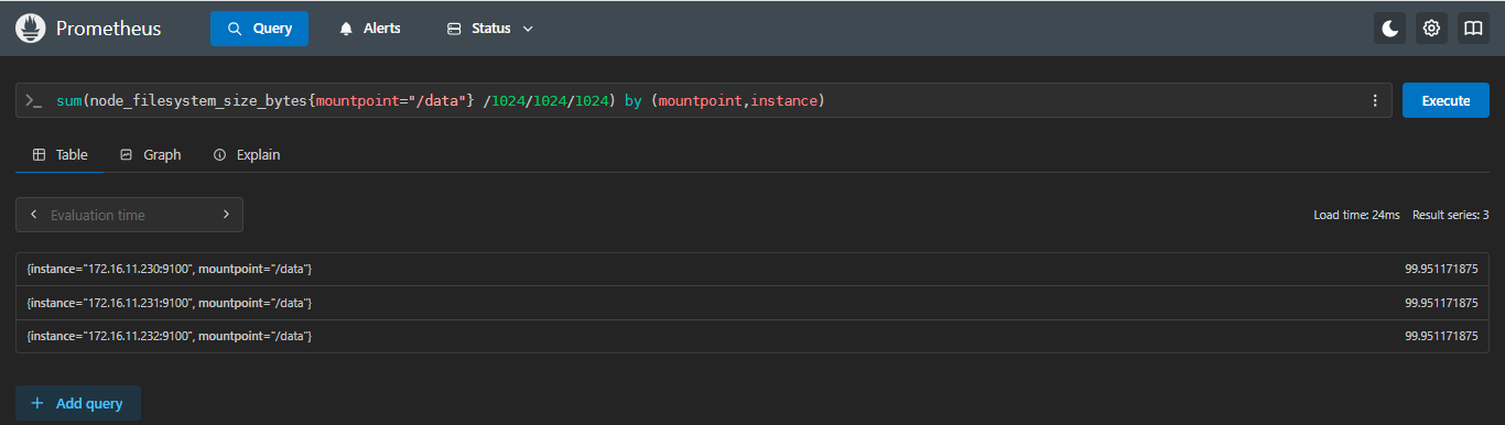 /data磁盘共多少G,并按mountpoint、instance进行分组;
