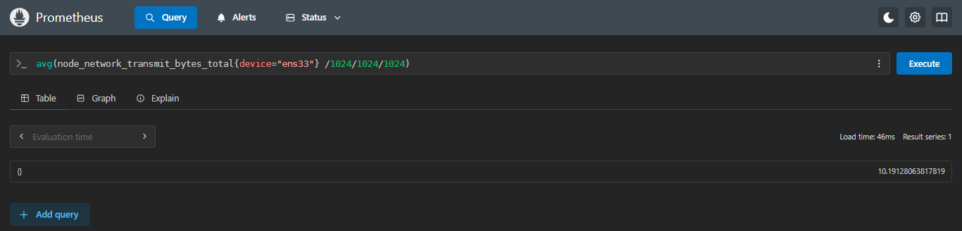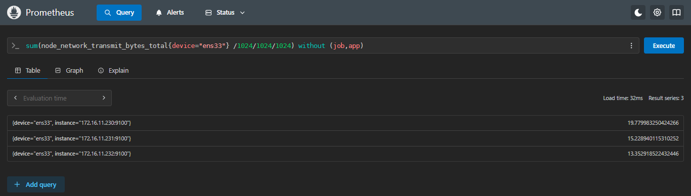 sum(node_network_transmit_bytes_total{device="ens33"} /1024/1024/1024) without (job,app)
