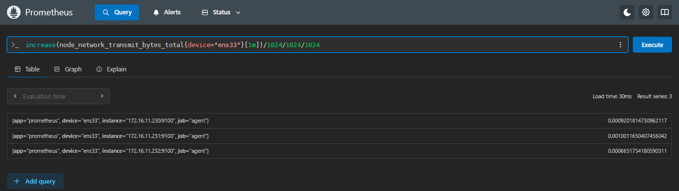 increase(node_network_transmit_bytes_total{device="ens33"}[1m])/1024/1024/1024
