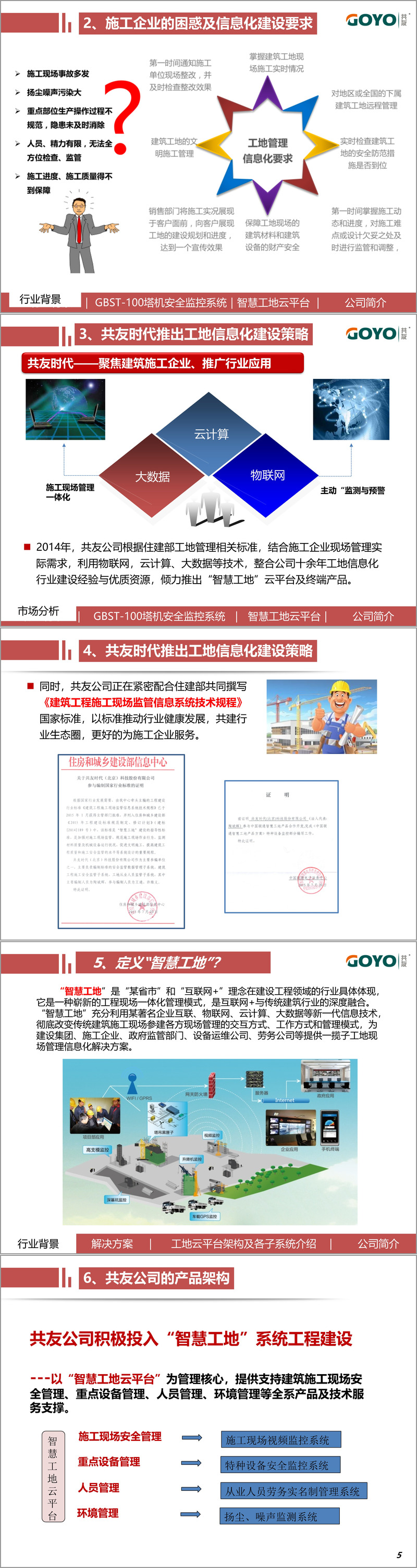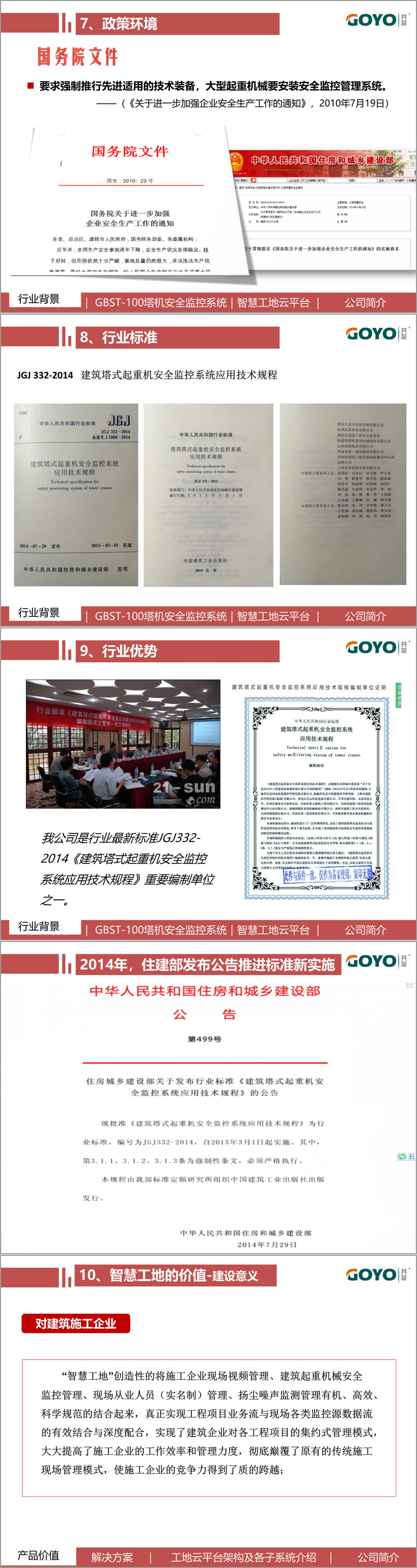 该系统的推出有着坚实的政策与标准支撑。国务院与住建部明确要求大型起重机械安装安全监控系统,JGJ332-2014《建筑塔式起重机安全监控系统应用技术规程》的强制实施,为智慧工地建设提供了明确遵循。共友时代作为该标准的重要编制单位,深度参与行业规范制定,其产品与解决方案天然契合政策要求与行业标准。