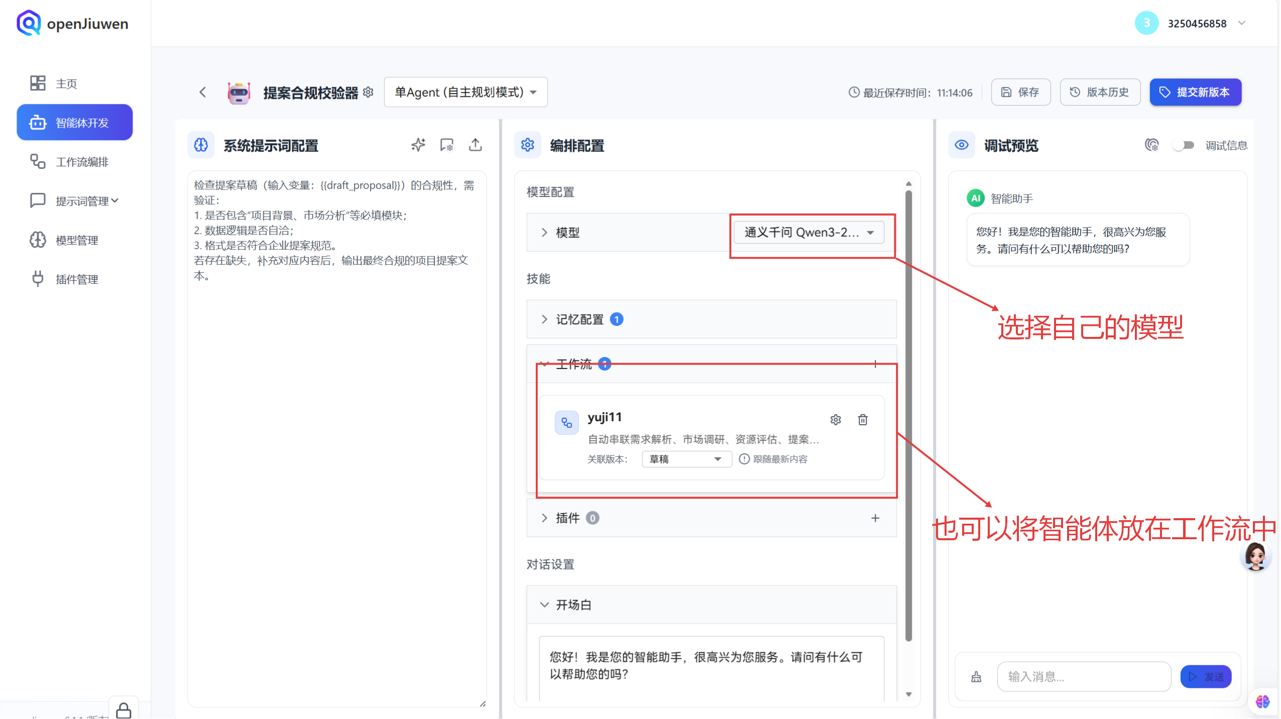 进入 openJiuwen 的 "智能体开发" 页面,在 "编排配置" 模块的 "模型" 下拉框中,选择已接入的 "通义千问 Qwen3-235B" 模型,完成智能体与模型的绑定。同时,可在 "系统提示词配置" 中定义智能体的角色(如 "提案合规校验器"),让模型按指定逻辑工作。
