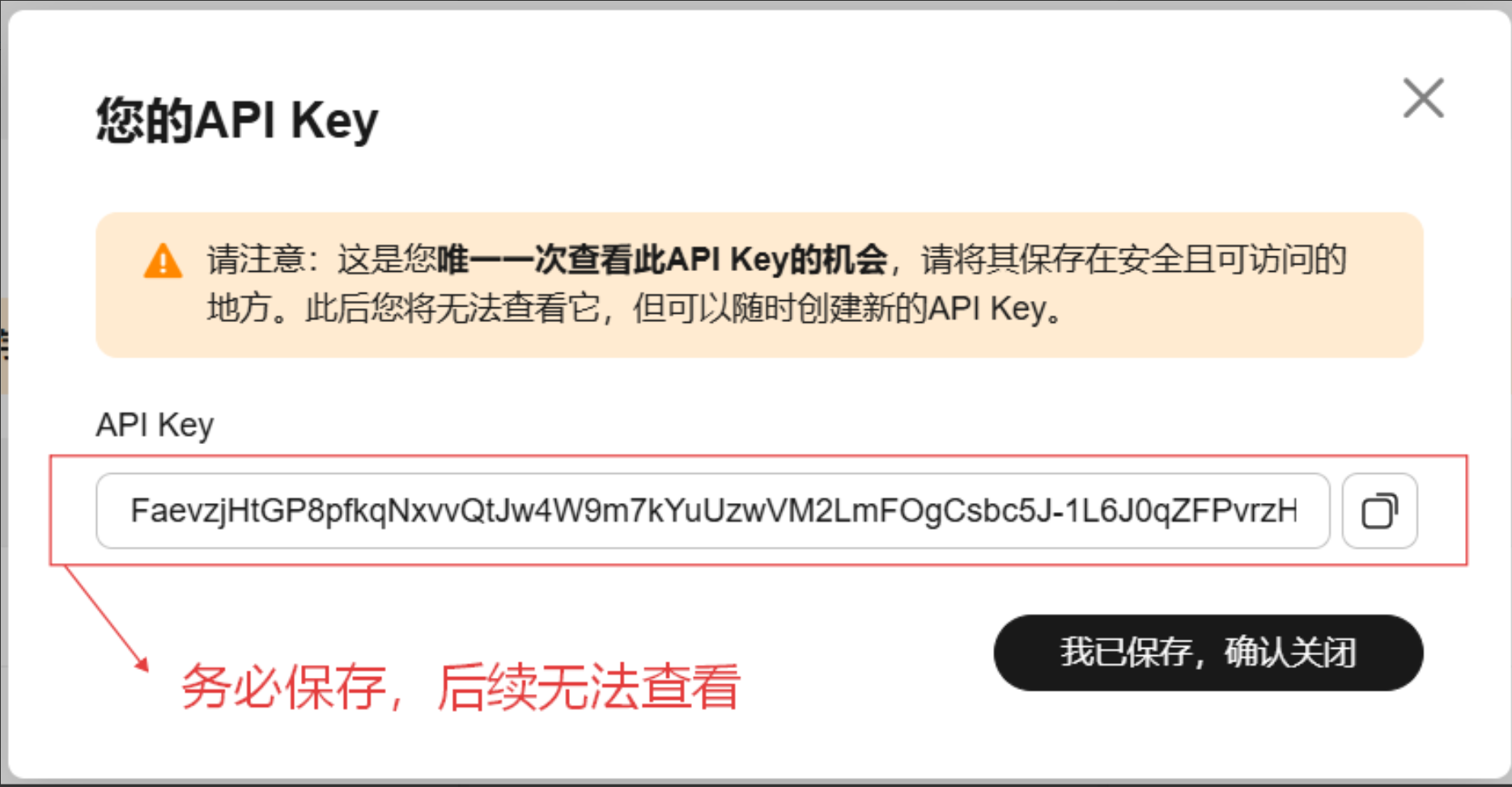点击 "创建 API Key" 后,系统弹出密钥展示窗口,此密钥仅会显示一次------ 必须立即复制并存储至安全位置(如加密文档),若丢失需重新创建。复制完成后点击 "我已保存,确认关闭" 完成密钥获取。