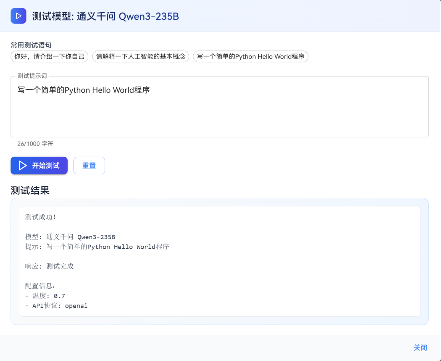 模型配置完成后,需通过测试确认其能否正常响应请求: