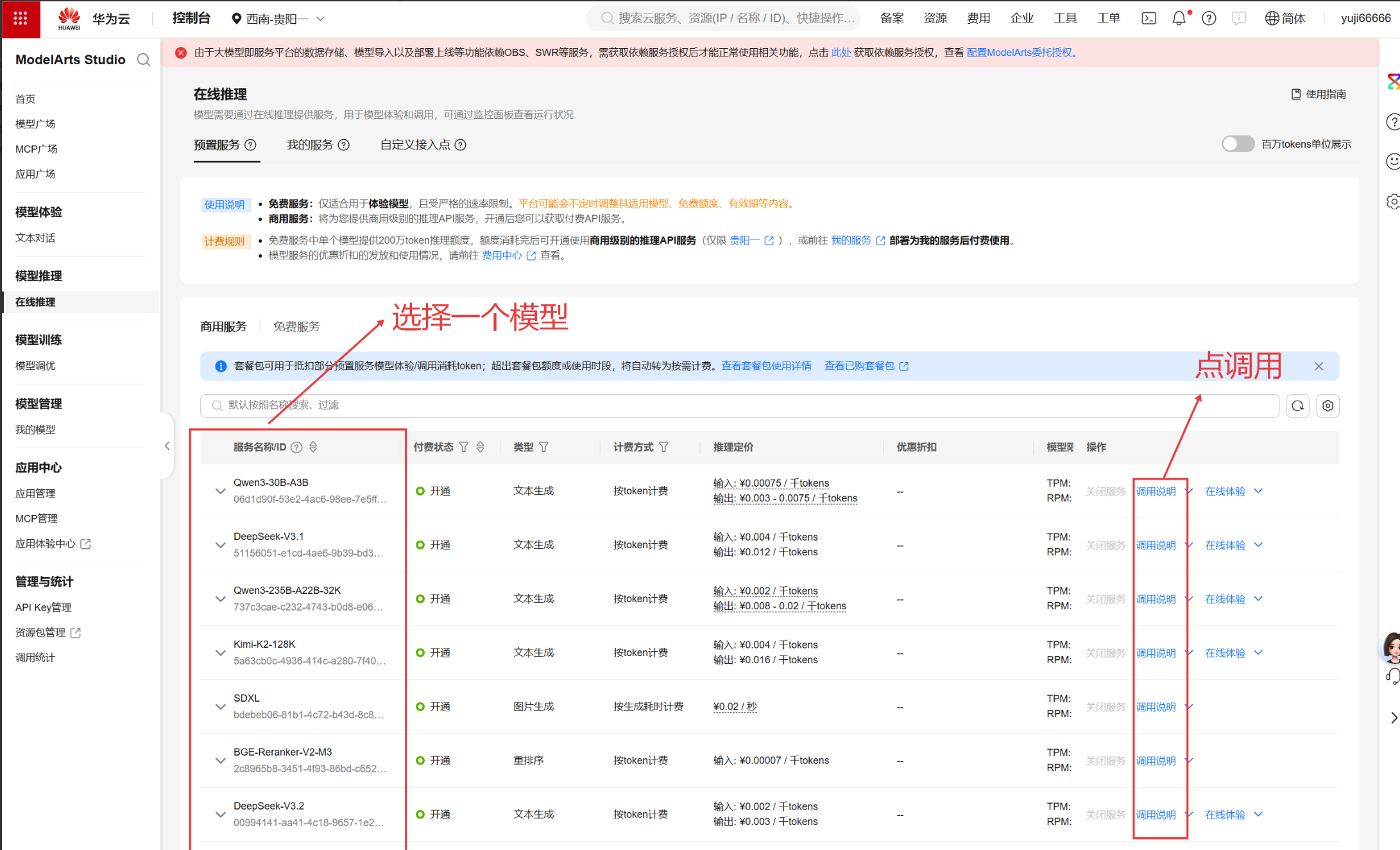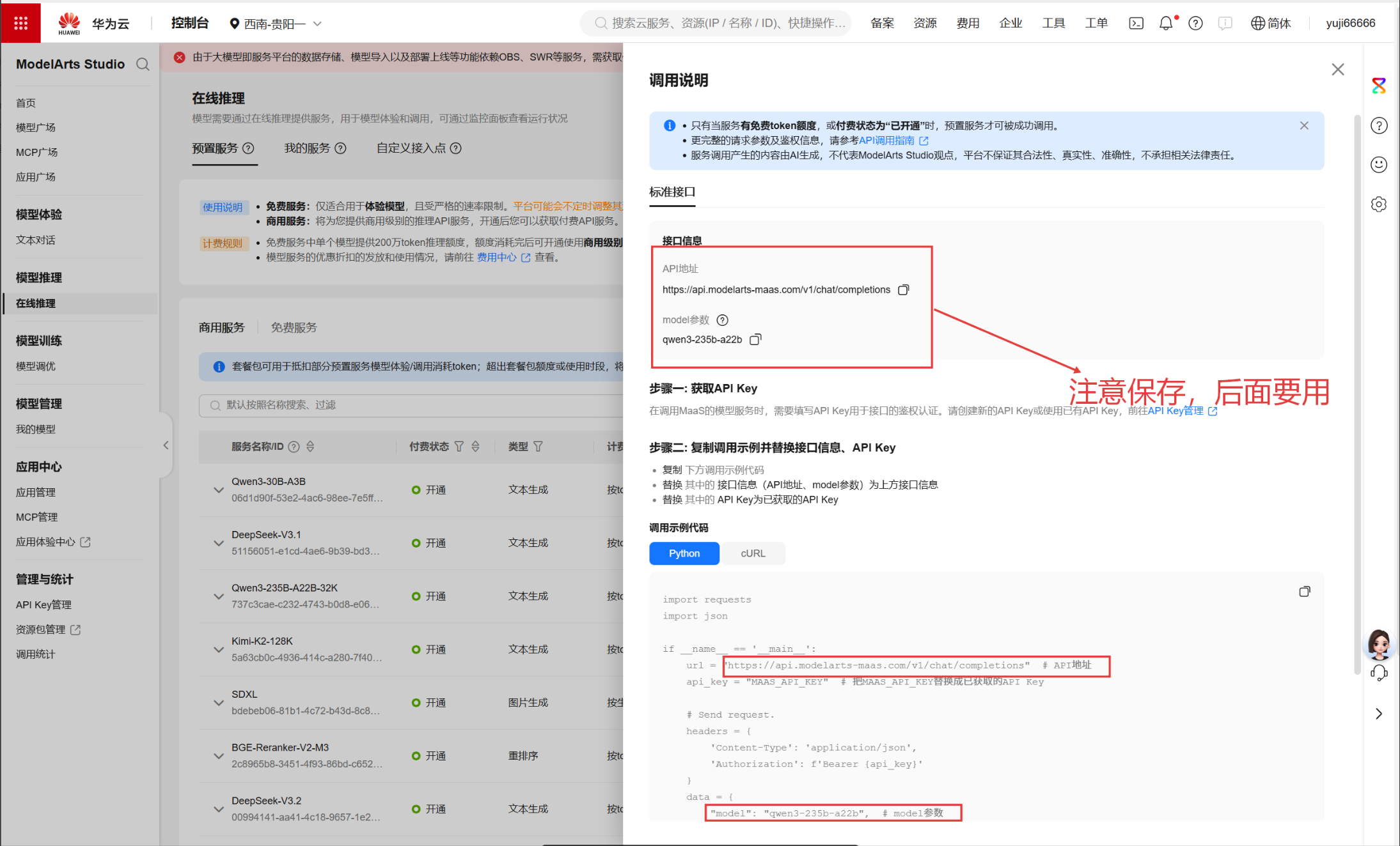 进入 ModelArts "在线推理" 页面,在免费服务列表中选择目标模型(如 "Qwen3-235B-A22B-32K"),点击模型右侧的 "调用说明" 按钮,获取接口配置的核心参数。