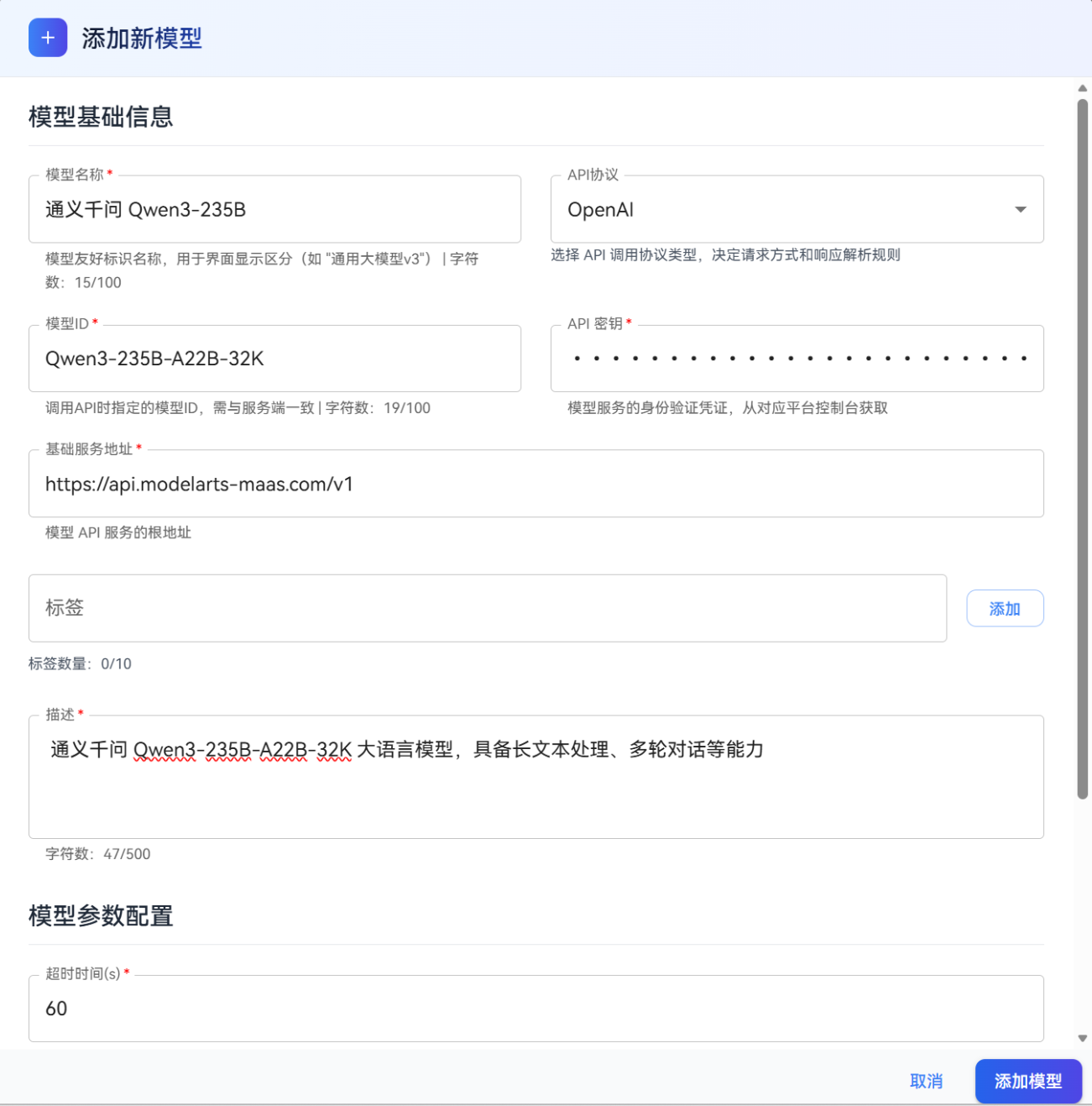https://api.modelarts-maas.com/v1(接口地址的根路径,匹配通义千问的服务域名); - 描述:补充模型功能(如 "通义千问 Qwen3-235B-A22B-32K 大语言模型,具备长文本处理、多轮对话等能力")。