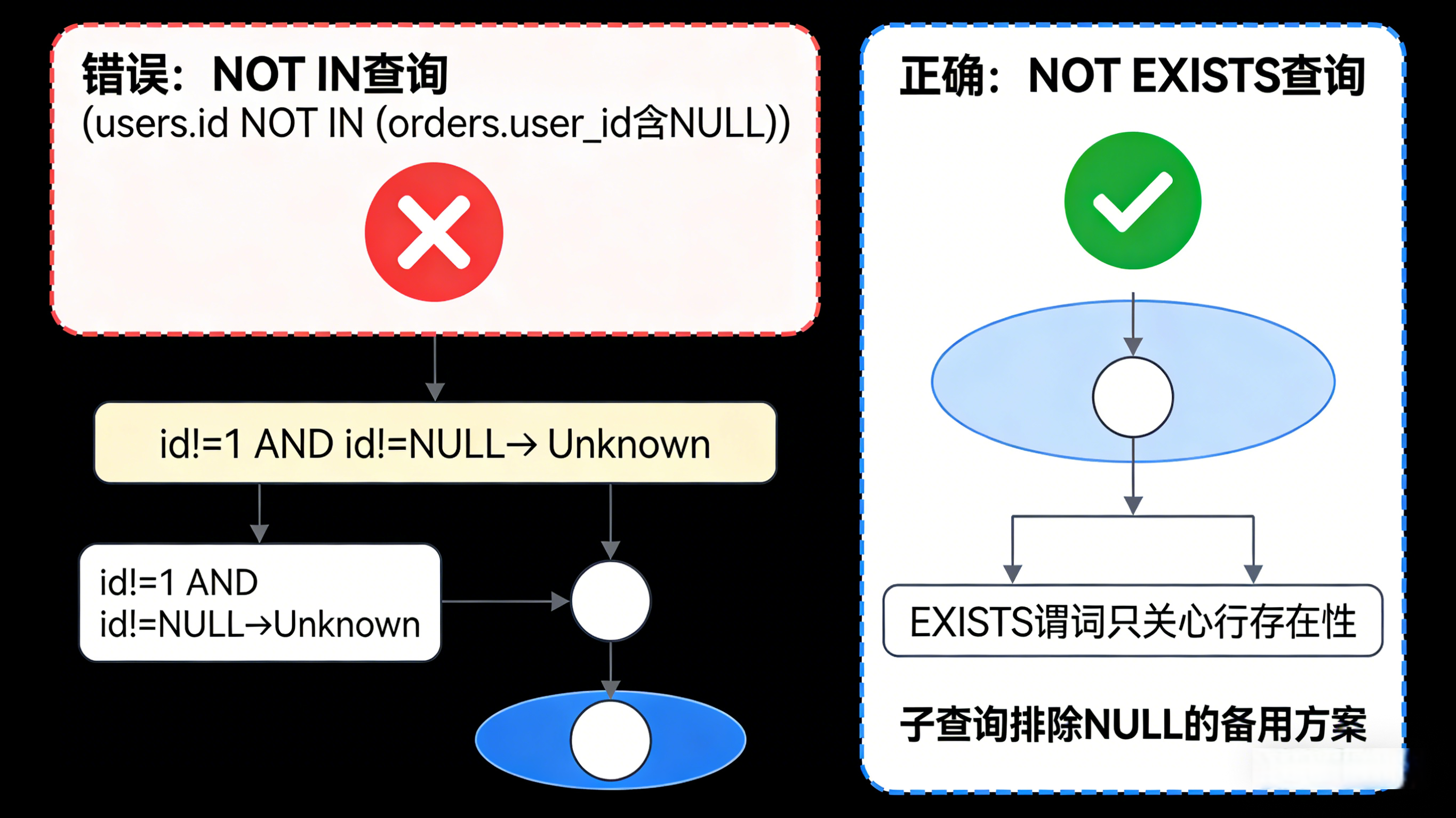 由于最终结果不是 True,该行被过滤。只要子查询中包含任何一个 NULL 值,整个 NOT IN 查询就会彻底失效,返回空结果。