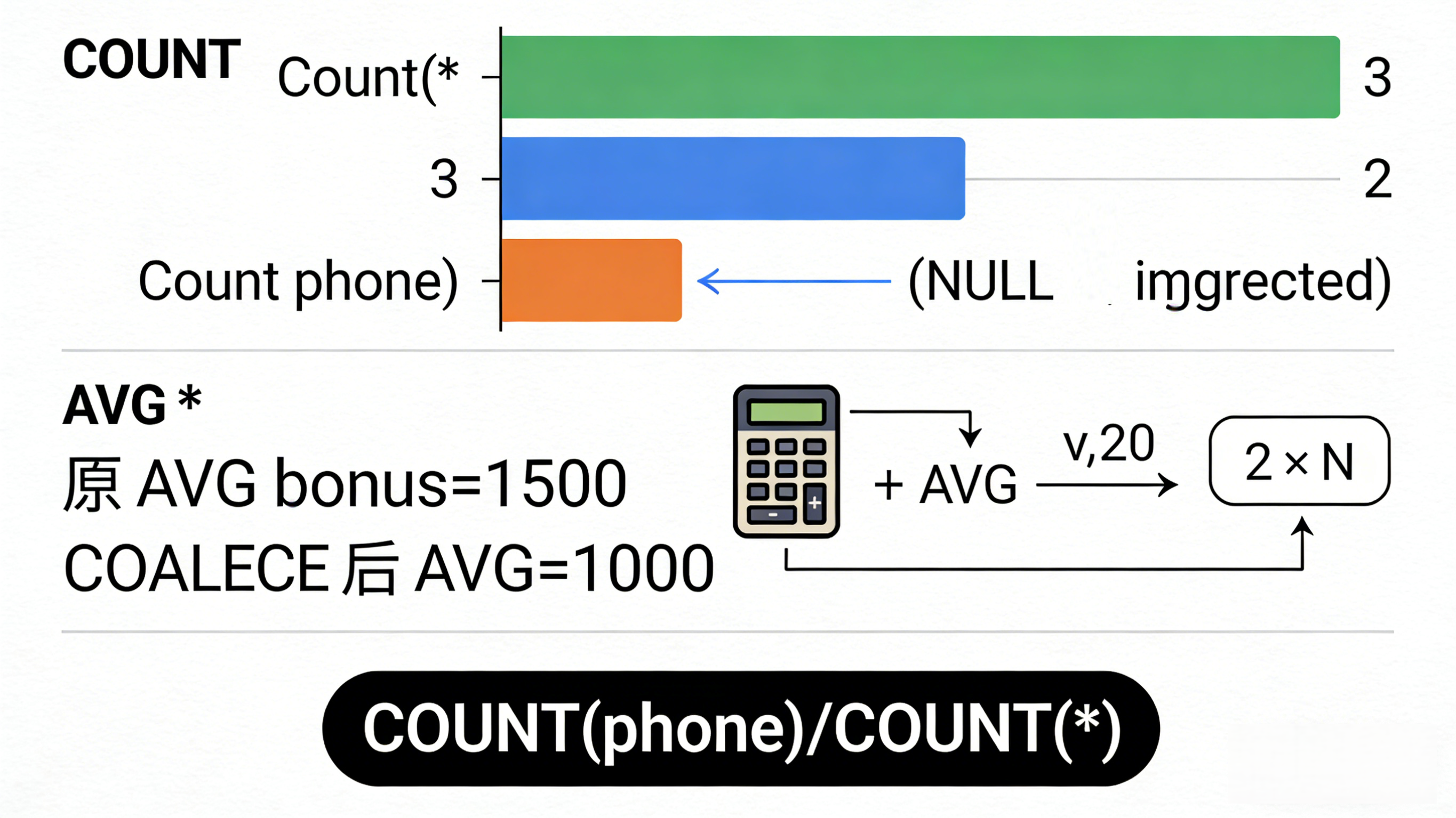 某部门 3 个人,奖金分别是:1000, 2000, NULL(未发)。