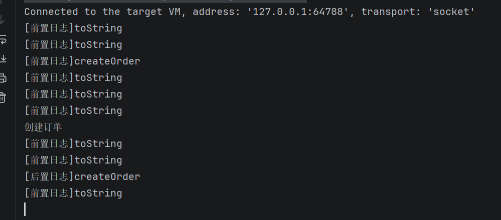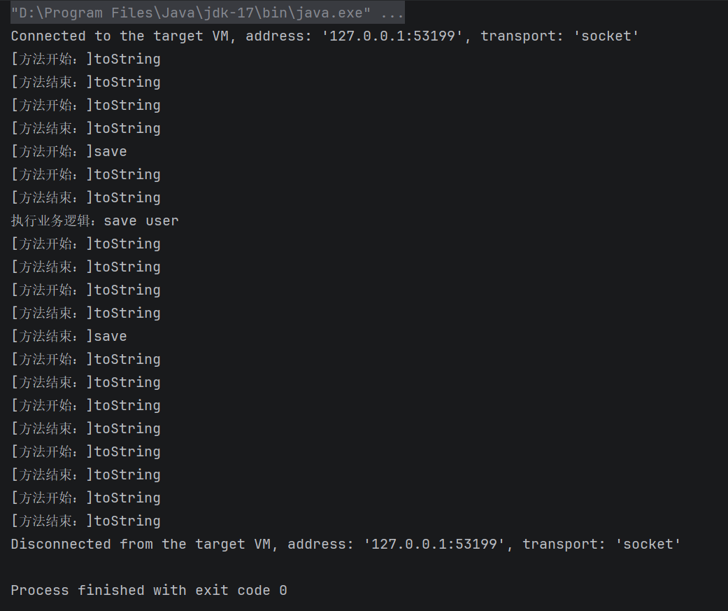 运行intercept中的逻辑,可以看到控制台打印了对应信息,和JDK动态代理一样,由于debug出现了很多toString方法的调用