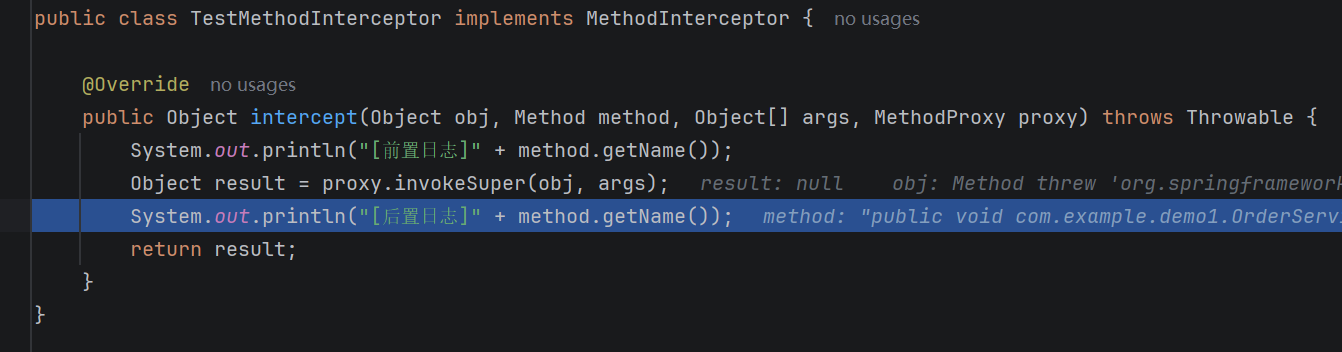 Object result = proxy.invokeSuper(obj, args);