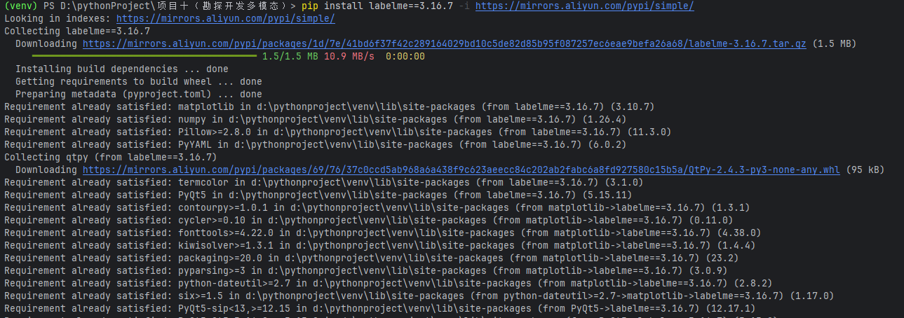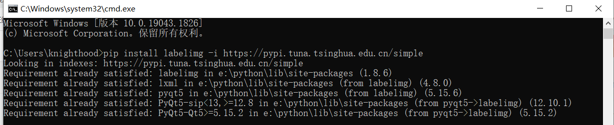 然后等待其自动帮你安装labelimg以及lxml和pyqt5(下图由于笔者已经安装过了,就不重新卸载安装了)