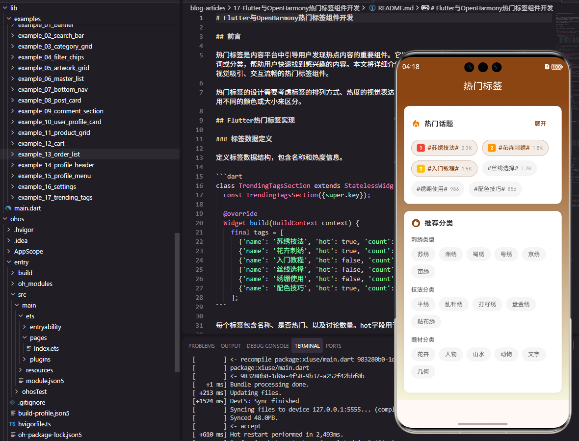 在移动应用开发中,热门标签组件是引导用户发现热点内容的关键入口。本文将详细介绍如何在Flutter框架下直接开发OpenHarmony应用,实现一个视觉吸引、交互流畅的热门标签组件。