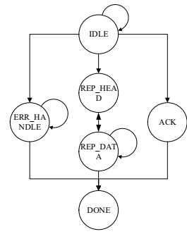 DONE:应答完成状态。该状态下将发送寄存器中剩余的最后一帧数据并生成指令完成信号。在一个时钟周期后回到 IDLE 状态。