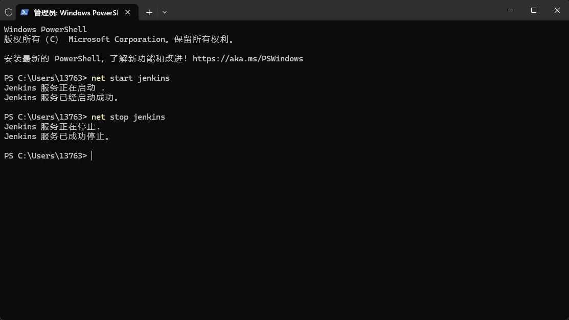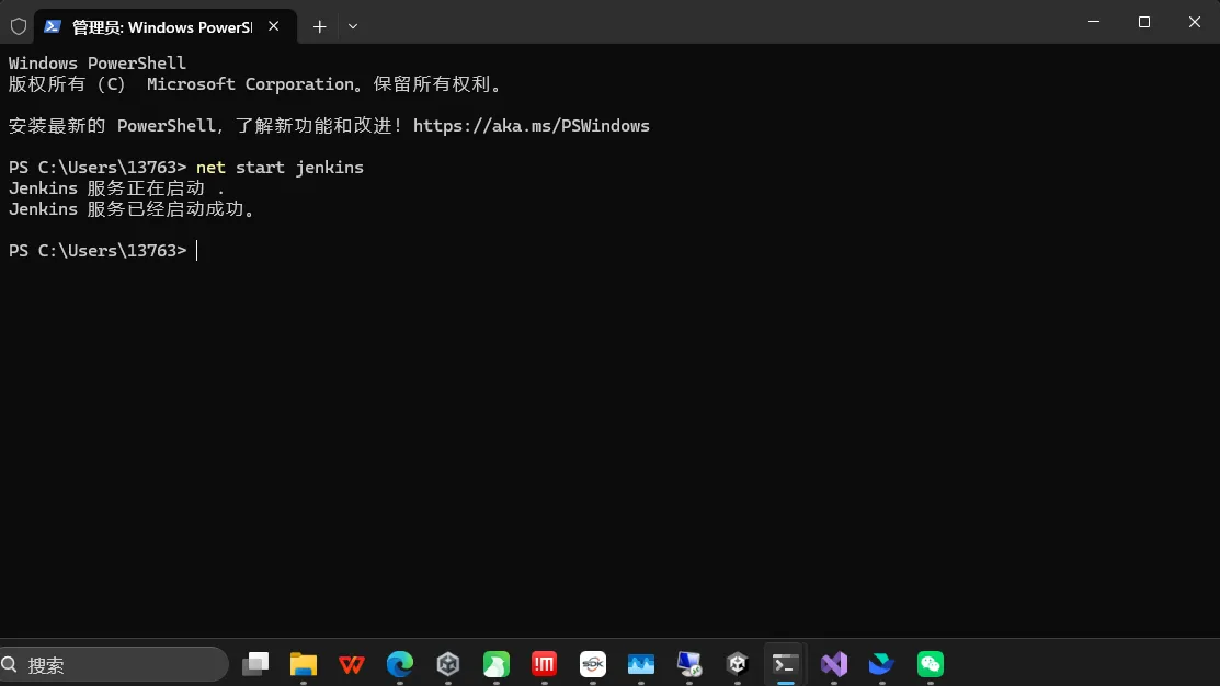 在管理员:Windows PowerShell面板,运行命令net start jenkins,如下: