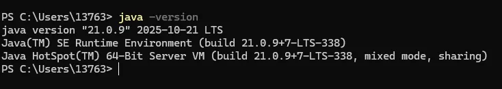 在管理员:Windows PowerShell面板,运行命令java -version,JDK安装成功显示:
