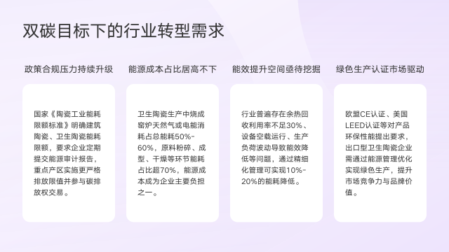 双碳目标下,卫生陶瓷行业面临着多方面的转型需求。首先,政策合规压力持续升级,国家出台能耗限额标准,要求企业提交能源审计报告,重点产区实施更严格排放限值与碳排放权交易,企业必须重视并遵循。其次,能源成本占比居高不下,烧成窑炉等环节能耗占比超七成,能源成本成为企业沉重负担。再者,能效提升空间亟待挖掘,行业存在余热回收利用率低等问题,通过精细化管理可降低10%-20%的能耗。最后,绿色生产认证成为市场驱动,欧盟、美国等认证对产品环保性能有要求,出口型企业需优化能源管理,提升竞争力与品牌价值。