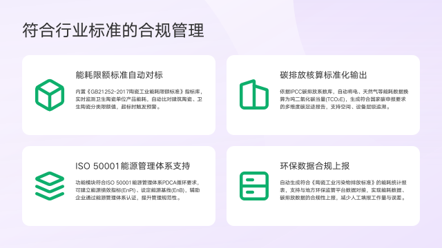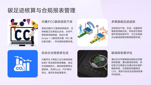 同时,它支持按生产线、车间、设备等多维度追踪碳足迹,可定位烧成窑炉等高排放环节,为企业碳减排提供精准的数据支撑,助力企业有针对性地开展减排工作。