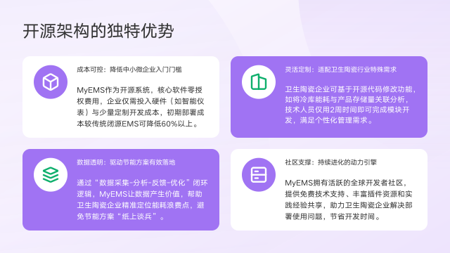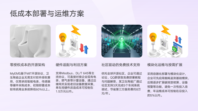 MyEMS开源架构具有四大独特优势,有效解决卫生陶瓷企业能源管理难题。其一,成本可控。核心软件零授权费用,企业只需投入硬件与少量定制开发成本,初期部署成本较传统闭源EMS降低60%以上,大大降低了中小微企业的入门门槛。
