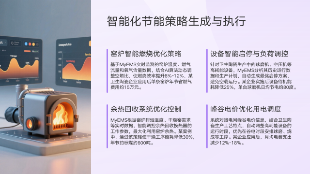 能源梯级利用智能调度基于实时能耗数据与生产计划构建模型,合理分配不同温度余热。某案例显示,该策略使企业综合能源利用率提升22%,吨瓷能耗下降15%。