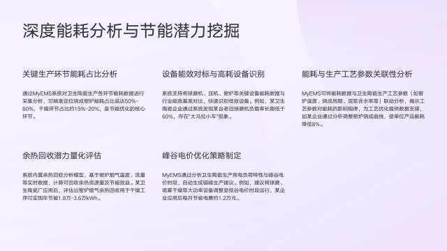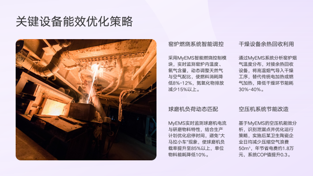 在卫生陶瓷生产中,关键设备的能效优化十分关键。MyEMS为窑炉、干燥设备、球磨机和空压机等关键设备提供了针对性的节能策略。