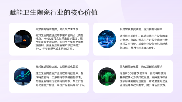 MyEMS赋能卫生陶瓷行业意义显著,主要体现在以下四点。其一,窑炉能耗是卫生陶瓷生产的主要成本,MyEMS可实时采集关键参数,结合生产负荷优化燃烧控制,某企业应用后窑炉热效率提升8%,年节省燃气成本约15万元。其二,该系统可通过监测生产设备实时负荷,自动识别空载运行状态并预警,能有效降低设备待机能耗,如某案例中设备待机能耗降低20%,单月节电约8000度。其三,MyEMS建立全流程能耗数据库,生成关键指标报表,帮助企业精准定位高耗能环节,某工厂据此优化排班,单位产品能耗降低12%。其四,系统内置IPCC碳排放因子库,可生成符合国家标准的碳足迹报告,助力企业满足环保政策要求,提升绿色竞争力。