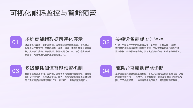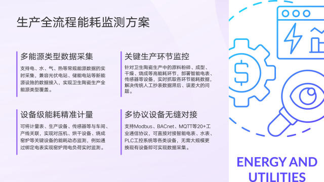 其核心定位是成为卫生陶瓷行业的能效管理工具,为卫生陶瓷企业提供从数据采集到节能落地的全链路解决方案。重点聚焦于烧成窑炉、干燥设备等高能耗环节,进行能源监控与优化,助力企业实现能耗可视化与精细化管控。