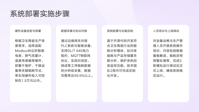 卫生陶瓷企业部署MyEMS系统,需遵循科学的实施步骤。硬件设备选型与部署方面,依据生产场景需求,选用适配Modbus协议的智能电表等硬件,部署于关键能耗节点,单车间硬件投入可控在1.5万元以内,有效控制成本。