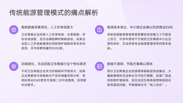 传统能源管理模式存在诸多痛点。其一,能耗数据采集滞后且人工抄表误差大,企业依赖人工抄录电表、水表数据,不仅存在估读误差,还无法捕捉瞬时能耗波动,如某企业因数据滞后月均浪费电量约5000度。其二,能源成本高企,中小微企业难以负担商业EMS,传统闭源系统部署成本高达几十万甚至上百万,使许多中小企业无法享受降本效益。其三,功能固化,无法匹配卫生陶瓷行业个性化需求,不同企业关注的能耗环节差异大,传统标准化EMS二次开发费用高、周期长。其四,数据不透明,节能方案难以落地,部分企业安装监测设备后,大量数据无法转化为可执行策略,节能措施沦为空谈。