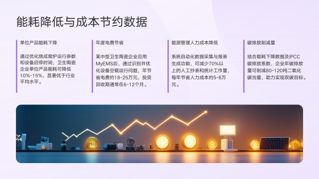 某中型卫生陶瓷企业应用MyEMS后,通过识别并优化设备空载运行问题,年节省电费约18-25万元,且投资回收期通常在6-12个月。这表明该系统不仅能有效降低运营成本,还能快速回收前期投入,为企业带来实实在在的经济效益。