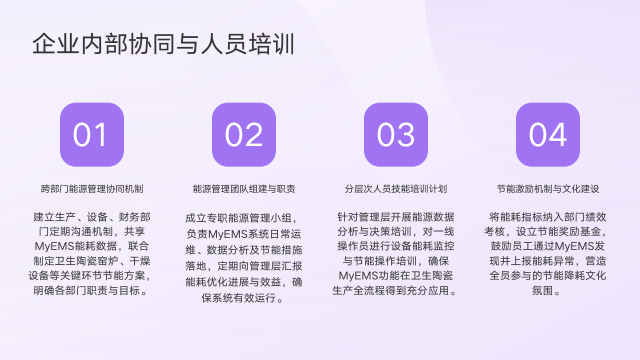 企业实施能源管理系统,需强化内部协同与人员培训。建立跨部门能源管理协同机制,生产、设备、财务部门定期沟通,共享MyEMS能耗数据,联合制定关键环节节能方案,明确各部门职责与目标。