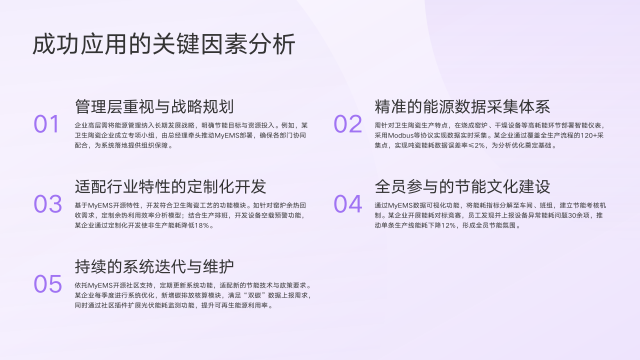 前面我们了解了MyEMS在卫生陶瓷企业的应用案例、效益以及能耗成本等情况。接下来这一页将聚焦实施路径与成功关键因素。了解这些内容能让我们清楚如何有效部署系统,确保其成功落地。那具体有哪些实施步骤和关键要素呢,让我们一起探究。