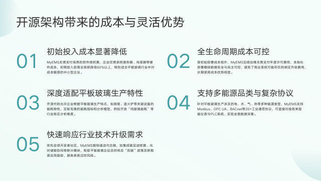 在适配性方面,MyEMS深度适配平板玻璃生产特性,企业可根据熔窑、退火炉等设备能耗特性定制专属指标与模型。同时,支持多能源品类与复杂协议,能对接各类智能仪表与PLC系统,实现全面数据采集。