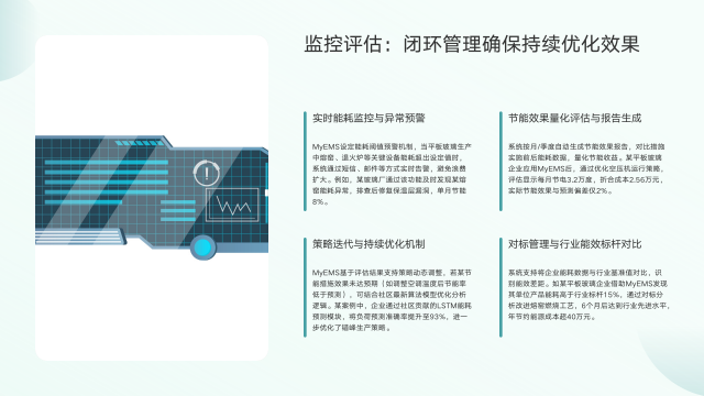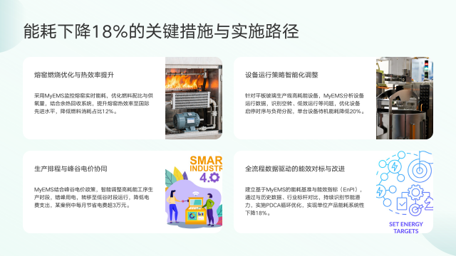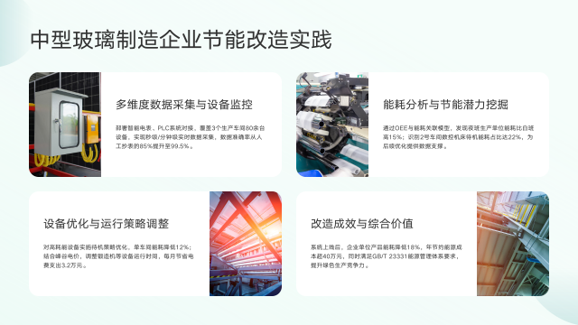 实现能耗下降18%,MyEMS采取了多方面关键措施与实施路径。其一,在熔窑燃烧方面,通过监控实时能耗,优化燃料配比与供氧量,并结合余热回收系统,将熔窑热效率提升至国际先进水平,有效降低燃料消耗占比12%。其二,针对平板玻璃生产线高耗能设备,分析运行数据,识别空转、低效运行问题,优化启停时序与负荷分配,使单台设备待机能耗降低20%。其三,结合峰谷电价政策,智能调整高耗能工序生产时段,错峰用电,降低电费支出,某案例每月节省超3万元。其四,建立能耗基准与能效指标,通过与历史数据、行业标杆对比,持续识别节能潜力,实施PDCA循环优化,实现单位产品能耗系统性下降。