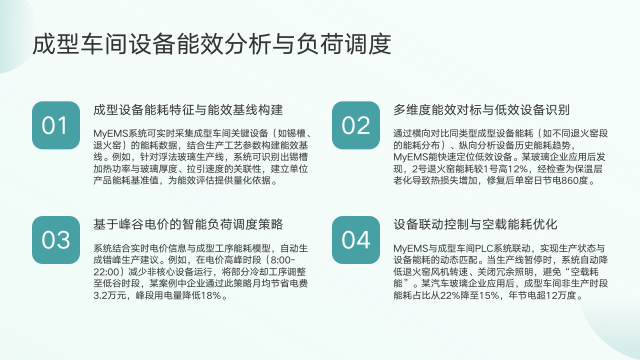 MyEMS系统可对成型车间设备进行能效分析与负荷调度。首先能构建成型设备能耗特征与能效基线,实时采集关键设备能耗数据,结合生产工艺参数,如针对浮法玻璃生产线,识别锡槽加热功率与玻璃厚度等的关联,建立单位产品能耗基准值,为评估提供量化依据。