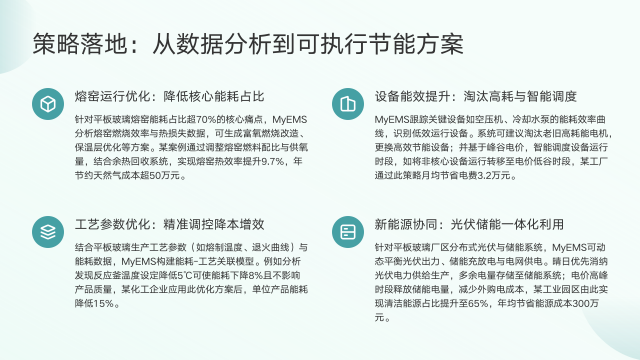 MyEMS能将数据分析转化为可执行的节能方案。针对平板玻璃熔窑能耗占比超70%的痛点,MyEMS分析燃烧效率与热损失数据,生成富氧燃烧改造等方案,某案例实现热效率提升9.7%,年节约天然气成本超50万元。
